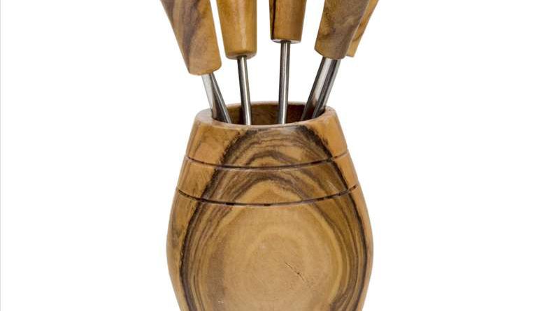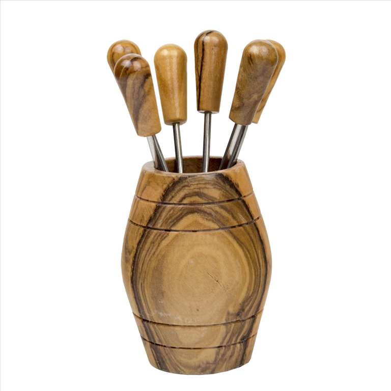Χειροποίητη βάση βαρελάκι από ξύλο ελιάς με 6 πιρουνάκια δίαινες με ξύλινη λαβή σε δυο μεγέθη.