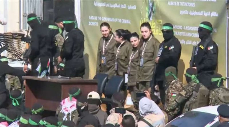 Η παλαιστινιακή ισλαμιστική οργάνωση Χαμάς παρέδωσε σήμερα τέσσερις Ισραλινές στρατιωτίνες που είχε συλλάβει ως ομήρους στη Διεθνή Επιτροπή του Ερυθρού Σταυρού έδειξαν απευθείας τηλεοπτικά πλάνα. Οι τέσσερις κοπέλες οδηγήθηκαν σε μία εξέδρα στην Πόλη της Γάζας εν μέσω ενός πλήθους Παλαιστινίων και περικυκλωμένες από δεκάδες ένοπλους άνδρες της Χαμάς. Χαιρέτισαν και χαμογέλασαν προτού αφεθούν ελεύθερες και εισέλθουν σε οχήματα της ΔΕΕΣ που θα τις μεταφέρουν στο Ισραήλ.