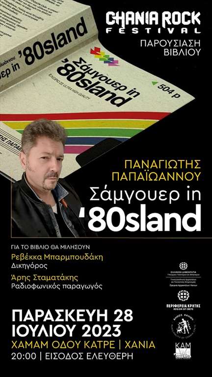 Το CHANIA ROCK FESTIVAL & οι ΕΚΔΟΣΕΙΣ ΙΩΛΚΟΣ σας προσκαλούν στην παρουσίαση του βιβλίου «Σάμγουερ In ’80sland» του Παναγιώτη Παπαïωάννου την Παρασκευή 28 Ιουλίου 2023 στις 20.30 στο αίθριο του ΧΑΜΑΜ ΤΗΣ ΟΔΟΥ ΚΑΤΡΕ στην Παλιά Πόλη Χανίων.