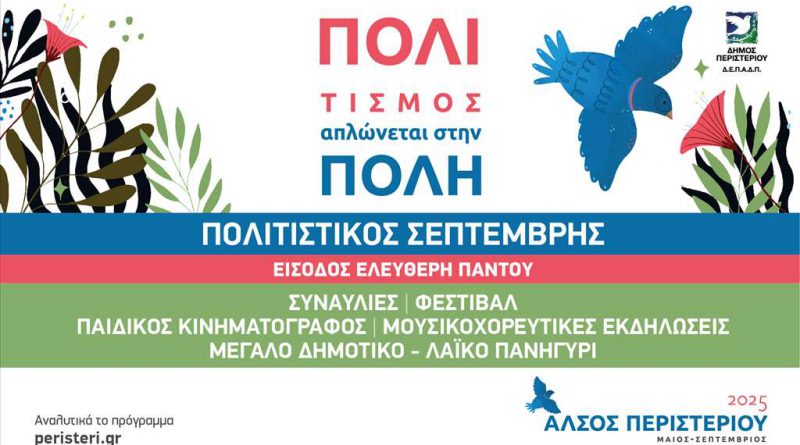 Ο Δήμος Περιστερίου, πιστός στο ραντεβού του με τον πολιτισμό, παρουσιάζει ένα πλούσιο και πολύπλευρο πρόγραμμα εκδηλώσεων για τον Σεπτέμβριο του 2025, κλείνοντας έναν μεγάλο κύκλο πολιτιστικών δράσεων που ξεκίνησε τον Μάιο. Όλες οι εκδηλώσεις θα πραγματοποιηθούν στο Άλσος Περιστερίου, το ωραιότερο Άλσος της Αττικής, με είσοδο ελεύθερη για όλους τους πολίτες.