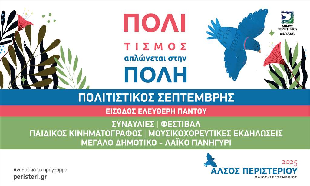 Ο Δήμος Περιστερίου, πιστός στο ραντεβού του με τον πολιτισμό, παρουσιάζει ένα πλούσιο και πολύπλευρο πρόγραμμα εκδηλώσεων για τον Σεπτέμβριο του 2025, κλείνοντας έναν μεγάλο κύκλο πολιτιστικών δράσεων που ξεκίνησε τον Μάιο. Όλες οι εκδηλώσεις θα πραγματοποιηθούν στο Άλσος Περιστερίου, το ωραιότερο Άλσος της Αττικής, με είσοδο ελεύθερη για όλους τους πολίτες.