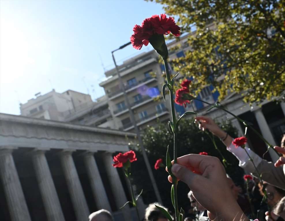Από νωρίς το πρωί εκατοντάδες πολίτες προσέρχονται στον χώρο του Πολυτεχνείου στο κέντρο της Αθήνας, προκειμένου να αφήσουν ένα λουλούδι στη μνήμη των ανθρώπων που αντιστάθηκαν και πολέμησαν για τη Δημοκρατία.