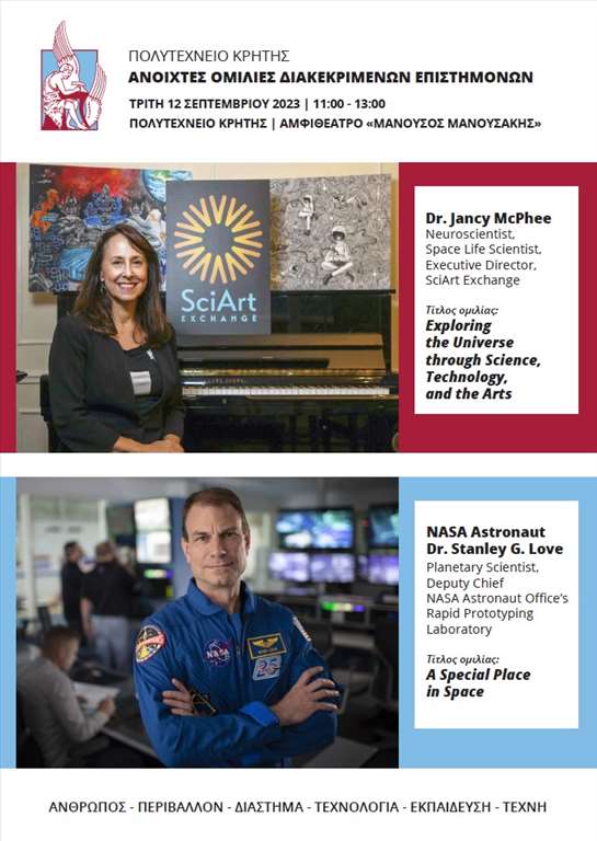 Στις 11, 12 και 13 Σεπτεμβρίου 2023, το Πολυτεχνείο Κρήτης έχει την τιμή να φιλοξενήσει δύο διακεκριμένους επιστήμονες, τον αστροναύτη της NASA, Dr. Stanley G. Love και τη νευροεπιστήμονα με εξειδίκευση στις επιστήμες του διαστήματος Dr. Jancy McPhee, στο πλαίσιο των δράσεων συνεργασίας που έχει αναπτύξει με κορυφαίους διεθνείς και εθνικούς φορείς για την προβολή των σύγχρονων επιστημονικών επιτευγμάτων του, της ενίσχυσης του εκπαιδευτικού του έργου αλλά και της εξωστρέφειας και της διασύνδεσης της έρευνας με την κοινωνία. Ως ακαδημαϊκό ίδρυμα που θεραπεύει τις επιστήμες του Μηχανικού, επιδιώκει διαρκώς τη σύνδεση της έρευνας αιχμής με χρήσιμες εφαρμογές στο περιβάλλον και στην καθημερινότητα των πολιτών για τη βελτίωση της ποιότητας ζωής.