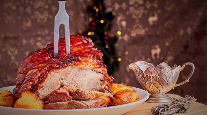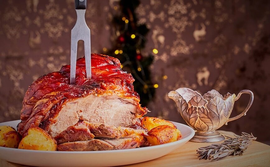 Ψήστε χωρίς κάλυμμα για περίπου 15- 20 λεπτά σε προθερμασμένο φούρνο στους 220 βαθμούς. Βγάλτε το χοιρινό από το φούρνο, καλύψτε το με αλουμινόχαρτο και χαμηλώστε τη θερμοκρασία στους 180 βαθμούς. Ψήστε για 1 ώρα ακόμα (προσθέστε μισό ποτήρι ζεστό νερό, αν το ταψί φαίνεται να στεγνώνει).