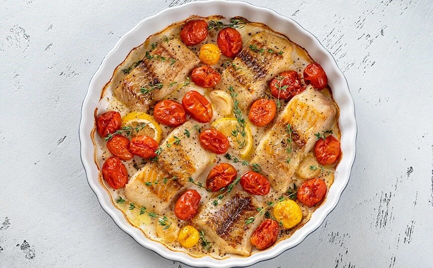 Προθερμάνετε το φούρνο στους 200 βαθμούς και σκουπίστε τα φιλέτα μπακαλιάρου με χαρτί κουζίνας μέχρι να στεγνώσουν. Αλατοπιπερώστε καλά.