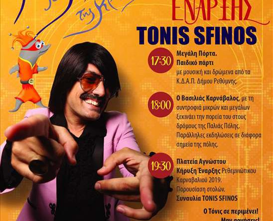 Και λίγο αργότερα… θα είναι μαζί μας ο Tonis Sfinos στην Κήρυξη της Έναρξης του Ρεθεμνιώτικου Καρναβαλιού 2019 – "Ο χορός στον χώρο και στον χρόνο" στις 19.30 στην Πλατεία Αγνώστου Στρατιώτη, όπου θα γίνει και η παρουσίαση των στολών!