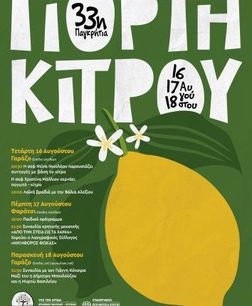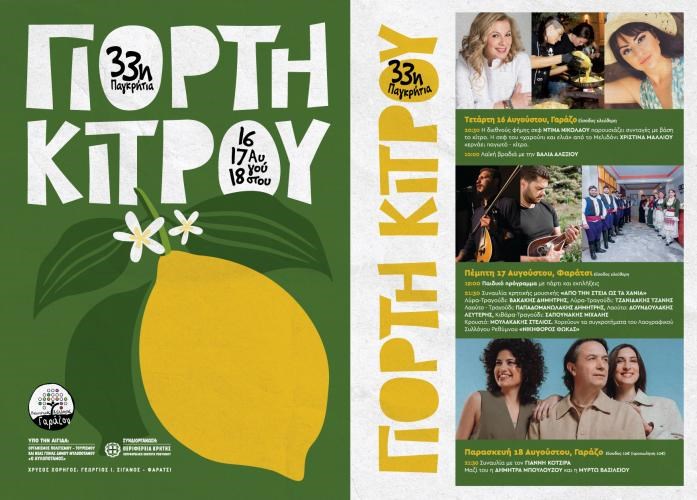 Η 33η Παγκρήτια Γιορτή Κίτρου θα πραγματοποιηθεί στις 16, 17 και 18 Αυγούστου στην Κοινότητα Γαράζου Δήμου Μυλοποτάμου και θα φιλοξενηθεί στο ομώνυμο χωριό καθώς και στον οικισμό Φαράτσι.