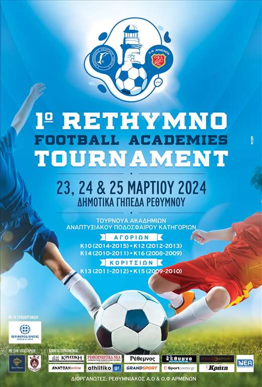 Οι διοργανωτές, τα σωματεία ΡΕΘΥΜΝΙΑΚΟΣ ΑΟ και ΟΦ ΑΡΜΕΝΩΝ, η συνδιοργανώτρια ΠΕΡΙΦΕΡΕΙΑ ΚΡΗΤΗΣ και οι υποστηρικτές του τουρνουά ΔΗΜΟΣ ΡΕΘΥΜΝΟΥ και ΕΠΣ ΡΕΘΥΜΝΟΥ παραχώρησαν συνέντευξη τύπου για το σημαντικό γεγονός για το Αναπτυξιακό Ποδόσφαιρο, που θα λάβει χώρα το τριήμερο 23-25 Μαρτίου σε Δημοτικά Γήπεδα του Δήμου Ρεθύμνου. Οι συμμετέχοντες ποδοσφαιριστές θα ξεπεράσουν τους 700 από 15 συλλόγους με 44 τμήματα από την Κρήτη και την Θεσσαλονίκη.