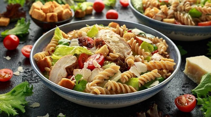 Μεταφέρετε το μείγμα ζυμαρικών σε μπολ ή πιατέλα σερβιρίσματος και προσθέστε το κοτόπουλο, τα κρουτόν και το ξύσμα παρμεζάνας πριν το σερβίρισμα.