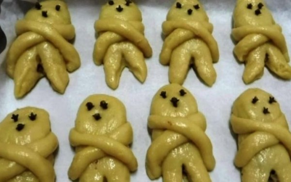 -Κόβουμε ένα μικρό κομμάτι ζυμάρι και το τυλίγουμε χιαστή. Καρφώνουμε ματάκια από γαρύφαλλα και αφήνουμε 15 λεπτά στην άκρη να ξεκουραστούν.