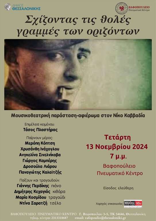 Μουσικοθεατρική παράσταση – αφιέρωμα στον Νίκο Καββαδία με τίτλο «Σχίζοντας τις θολές γραμμές των οριζόντων» διοργανώνει το Βαφοπούλειο Πνευματικό Κέντρο σήμερα, Τετάρτη 13 Νοεμβρίου 2024, σε συνεργασία με τη θεατρική ομάδα εκπαιδευτικών Θεσσαλονίκης «ΜΙΜΗΣΙΣ ΠΡΑΞΕΩΣ».