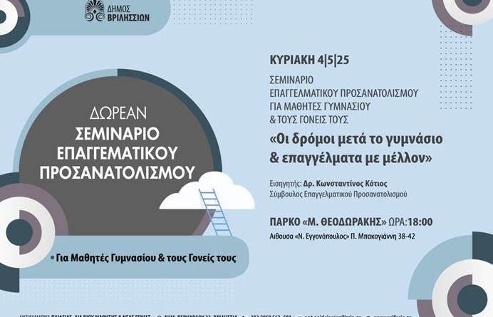 Δωρεάν σεμινάριο επαγγελματικού προσανατολισμού διοργανώνει η Αντιδημαρχία Παιδείας του Δήμου Βριλησσίων με εισηγητή τον Δρ. Κωνσταντίνο Κότιο την προσεχή Κυριακή 4/5 στις 18:00 στην αίθουσα «Νίκος Εγγονόπουλος» του πάρκου Μ. Θεοδωράκης (πρ. ΤΥΠΕΤ).