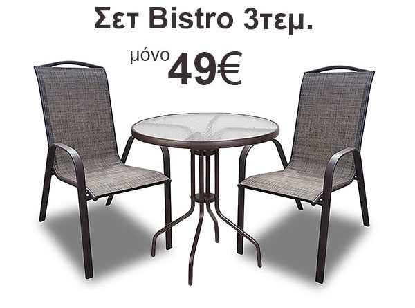 To σετ Bistro αποτελείται από δυο πολυθρόνες στοιβαζόμενες από ενισχυμένο μεταλλικό σκελετό & textiline πανί 2*1 και ένα να τραπέζι στογγυλό από μεταλλικό σκελετό με γυάλινη επιφάνεια water-glass security. Ανθεκτικό στον ήλιο & τη βροχή. Το προϊόν διατίθεται σε πακέτο με αμοντάριστο το τραπέζι, υπάρχουν οδηγίες & εργαλεία συναρμολόγησης στην συσκευασία. Οι καρέκλες είναι εργοστασιακά συσκευασμένες (έτοιμες).