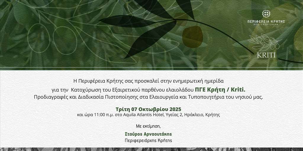 Ο Περιφερειάρχης Κρήτης, Σταύρος Αρναουτάκης, προσκαλεί όλους τους ελαιοπαραγωγούς, τους ιδιοκτήτες και εκπροσώπους ελαιουργείων και τυποποιητικών μονάδων, καθώς και κάθε εμπλεκόμενο στην αλυσίδα παραγωγής και εμπορίας του ελαιολάδου, να συμμετάσχουν στην εκδήλωση. Σκοπός της ημερίδας είναι η αναλυτική παρουσίαση του πλαισίου που διέπει το ΠΓΕ, των προδιαγραφών παραγωγής και των διαδικασιών που απαιτούνται για την πιστοποίηση του προϊόντος.