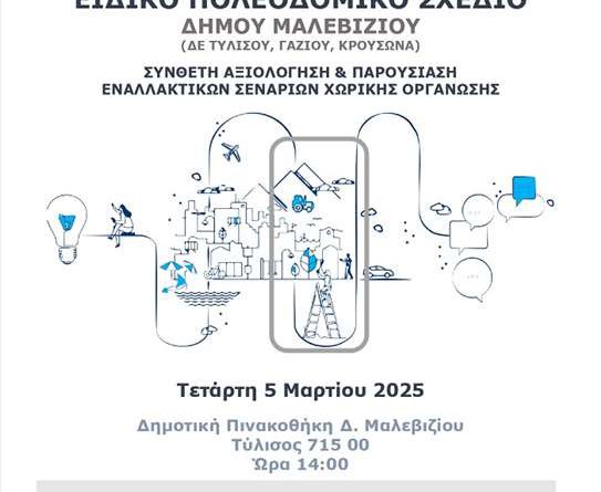 Σήμερα στις 14.00 η παρουσίαση των εναλλακτικών σεναρίων χωρικής ανάπτυξης του Ειδικού Πολεοδομικού Σχεδίου Μαλεβιζίου