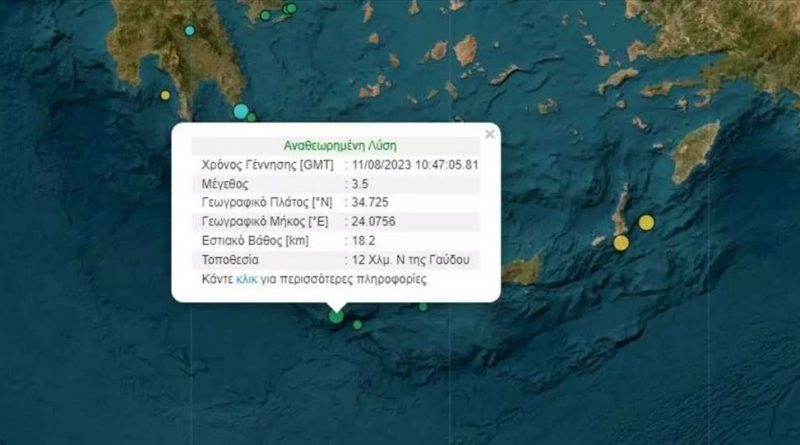 Σεισμός έντασης 3,5 βαθμών της κλίμακας Ρίχτερ σημειώθηκε στη θαλάσσια περιοχή της Γαύδου, το μεσημέρι της Παρασκευής (11/8).