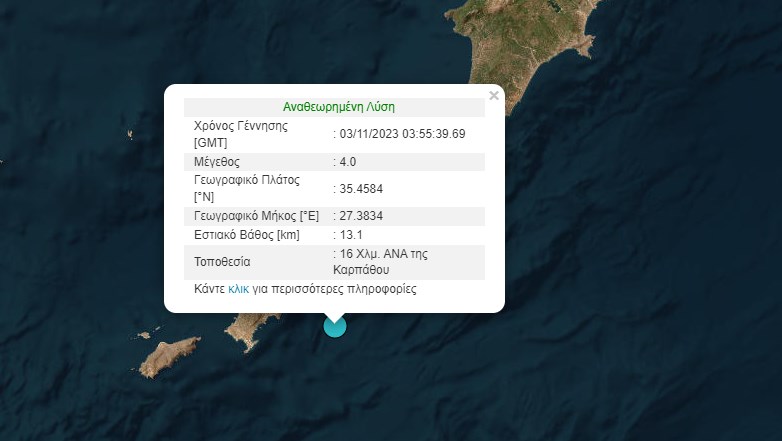 Σεισμική δόνηση μεγέθους 4 βαθμών της Κλίμακας Ρίχτερ σημειώθηκε στις 5:56 τα ξημερώματα της Παρασκευής (3/11) στη θαλάσσια περιοχή της Καρπάθου.