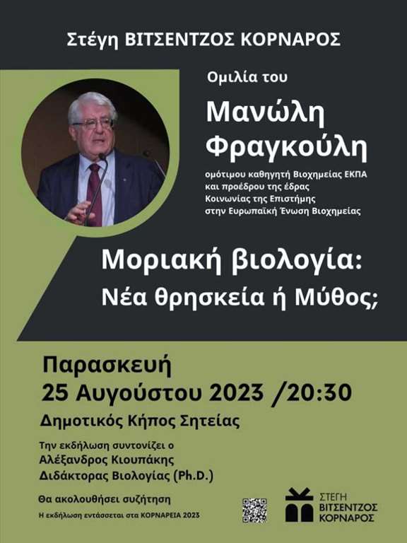 Ομιλία του Μανώλη Φραγκούλη την Παρασκευή 25 Αυγούστου 2023 στον Δημοτικό Κήπο Σητείας με θέμα Μοριακή Βιολογία: Νέα Θρησκεία ή Μύθος;