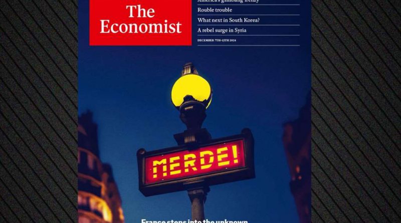 Ωστόσο το πρωτοσέλιδο του Economist σχολιάζει την κατάσταση στη Γαλλία μετά την κατάρρευση της κυβέρνησης Μπαρνιέ υποστηρίζοντας πως η χώρα «βαδίζει προς το άγνωστο» και με μία πινακίδα η οποία αναγράφει «σκ…».