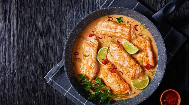Μειώστε ελαφρώς τη φωτιά και ρίξτε σιγά σιγά το γάλα καρύδας, προσθέστε τη σος sriracha και τη σάλτσα ψαριού και αφήστε να σιγοβράσει. Επιστρέψτε τον σολομό στο τηγάνι και αφήστε τον να σιγοβράσει μέχρι να ξεφλουδίσει εύκολα με ένα πιρούνι, περίπου 15 λεπτά ανάλογα με το πάχος του σολομού.