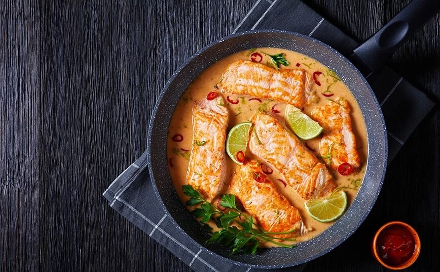 Μειώστε ελαφρώς τη φωτιά και ρίξτε σιγά σιγά το γάλα καρύδας, προσθέστε τη σος sriracha και τη σάλτσα ψαριού και αφήστε να σιγοβράσει. Επιστρέψτε τον σολομό στο τηγάνι και αφήστε τον να σιγοβράσει μέχρι να ξεφλουδίσει εύκολα με ένα πιρούνι, περίπου 15 λεπτά ανάλογα με το πάχος του σολομού.