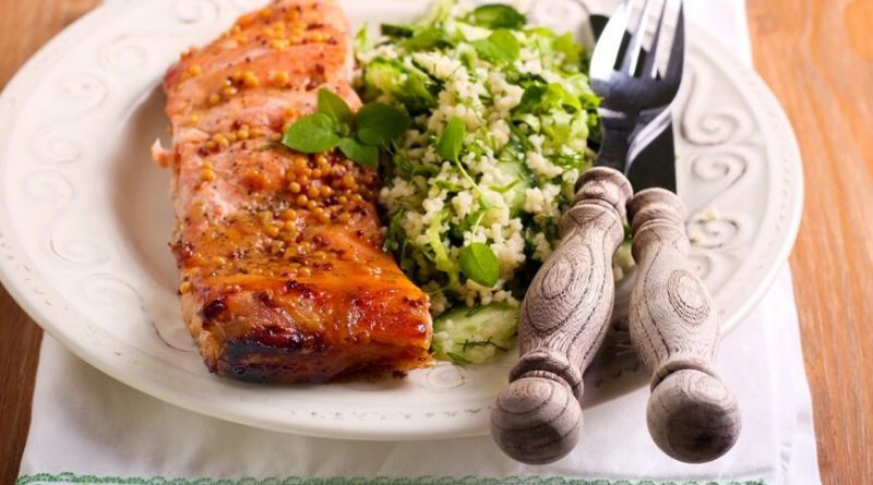 Μεταφέρετε το σολομό στο ταψί και αλείψτε με το μείγμα μουστάρδας.