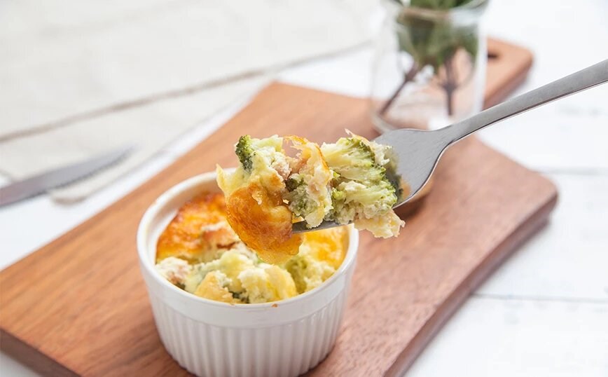 Συνδυάστε το μπρόκολο, τα αυγά, τη μαγιονέζα και το κρεμμύδι σε ένα πυρέξ, καλύψτε με τη λευκή σάλτσα και ανακατέψτε καλά.