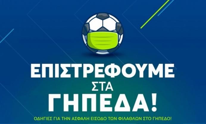 Μένουμε ασφαλείς, σεβόμαστε τις διαδικασίες σταδιακής επιστροφής των φιλάθλων στο 10% της χωρητικότητας των κερκίδων στα γήπεδα και δίνουμε ένα μήνυμα: «Επιστροφή στις κερκίδες, ώρα ευθύνης για όλους μας!»