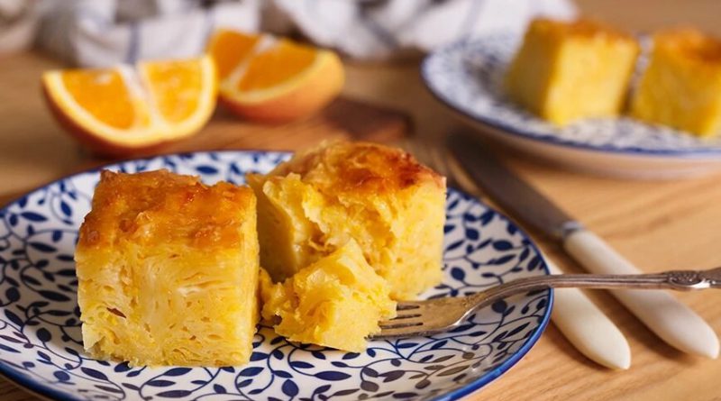 Σκίστε κάθε φύλλο σε κομματάκια και στοιβάξτε τα στο ταψί. Αφήστε τα τεμαχισμένα φύλλα να στεγνώσουν λίγο, ενώ ετοιμάζετε τα υπόλοιπα υλικά. Κόψτε 1 πορτοκάλι στη μέση και κόψτε το 1 μισό σε πολύ λεπτά μισοφέγγαρα για να γαρνίρετε το γλυκό. Ξεφλουδίστε και στύψτε σε χυμό τα υπόλοιπα 2 1/2 πορτοκάλια.