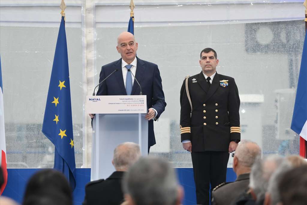 «Είναι μεγάλη τιμή να βρίσκομαι σήμερα εδώ στη Λοριάν, στα ναυπηγεία της “Naval Group”, επ’ ευκαιρία μιας ιδιαίτερα συμβολικής στιγμής·της έπαρσης της ελληνικής σημαίας στη φρεγάτα αμύνης και παρέμβασης Φ/Γ «Κίμων» την πρώτη FDI που προορίζεται για το Πολεμικό Ναυτικό της Ελλάδας.