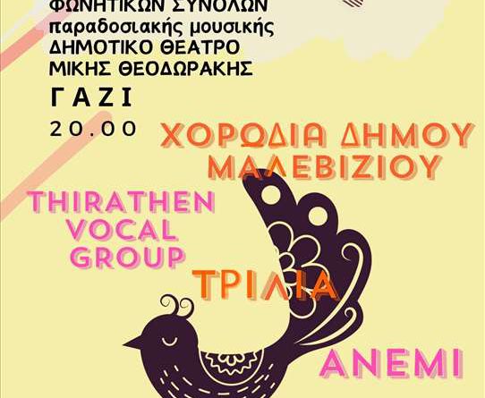Πολυφωνίες και μονοφωνίες θα πλημμυρίσουν τη συναυλία με ήχους από την παράδοση. Η εκδήλωση θα πραγματοποιηθεί με την υποστήριξη του Δήμου Μαλεβιζίου και θα ξεκινήσει στις 20.00.