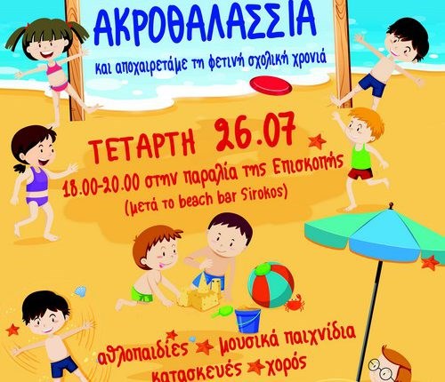 Την Τετάρτη 26 Ιουλίου 2023, από τις 6 το απόγευμα έως τις 8 το βράδυ, στην παραλία Επισκοπής ( μετά το beach bar Sirokos), «Παίζουμε στην ακροθαλασσιά και αποχαιρετάμε τη φετινή σχολική χρονιά!» μέσα από πλούσιες ψυχοκινητικές δραστηριότητες που αναδεικνύουν τις δεξιότητες των παιδιών και τα ενθαρρύνουν να τις καλλιεργήσουν.