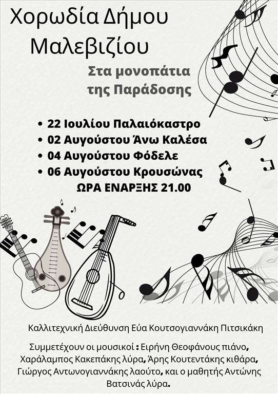 Οι επόμενες παραστάσεις που έχει προγραμματίσει η Δημοτική Χορωδία Μαλεβιζίου είναι στις 04 Αυγούστου στο Φόδελε και στις 06 Αυγούστου στον Κρουσώνα.