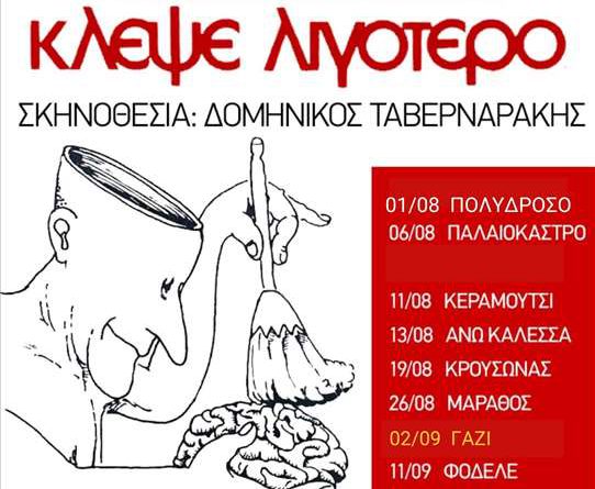 Στο Γάζι θα παρουσιάσει το έργο του Ντάριο Φό «Κλέψε Λιγότερο απόψε στο Ανοιχτό Δημοτικό Θέατρο Μίκης Θεοδωράκης στις 21.00 η Θεατρική Ομάδα του Δήμου Μαλεβιζίου.