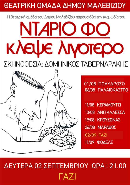 Στο Γάζι θα παρουσιάσει το έργο του Ντάριο Φό «Κλέψε Λιγότερο απόψε στο Ανοιχτό Δημοτικό Θέατρο Μίκης Θεοδωράκης στις 21.00 η Θεατρική Ομάδα του Δήμου Μαλεβιζίου.