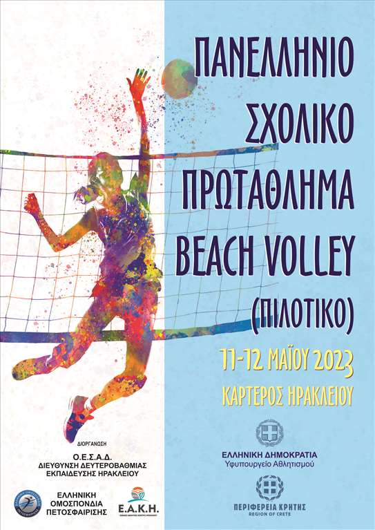 Η οργανωτική Επιτροπή Σχολικών Αθλητικών Δραστηριοτήτων (ΟΕΣΑΔ) ΔΔΕ ΗΡΑΚΛΕΊΟΥ και η Ελληνική Ομοσπονδία Ποδοσφαίρισης συνδιοργανώνουν με την Περιφέρεια Κρήτης και το Υφυπουργείο Αθλητισμού το Πανελλήνιο πιλοτικό Πρωτάθλημα Βeach Volley ΓΕΛ -ΕΠΑΛ. Η διοργάνωση πραγματοποιείται επίσης με τη στήριξη του ΕΑΚΗ και θα διεξαχθεί 11 και 12 Μαΐου 2023 στις παράκτιες αθλητικές εγκαταστάσεις Καρτερού.