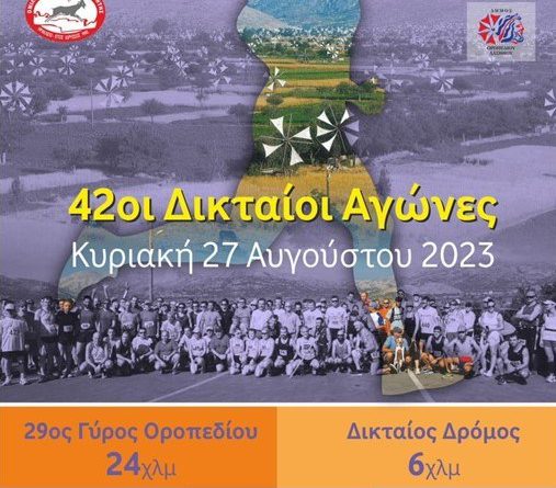 Ο όμιλος υπέρ αποστάσεων Κρήτης και ο πολιτιστικός σύλλογος Ψυχρού « Ξένιος Ζευς» διοργανώνουν με την υποστήριξη της Περιφέρειας Κρήτης, του Δήμο Οροπεδίου Λασιθίου και του Δήμου Ιεράπετρας τους «42 Δικταίους Αγώνες – ZEUSRUN 2023».