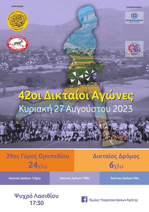 Ο όμιλος υπέρ αποστάσεων Κρήτης και ο πολιτιστικός σύλλογος Ψυχρού « Ξένιος Ζευς» διοργανώνουν με την υποστήριξη της Περιφέρειας Κρήτης, του Δήμο Οροπεδίου Λασιθίου και του Δήμου Ιεράπετρας τους «42 Δικταίους Αγώνες – ZEUSRUN 2023».