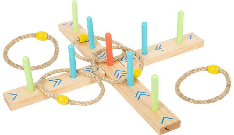Στόχος από 100% FSC® πιστοποιημένο ξύλο με 9 χρωματιστούς πίρους και 5 δαχτυλίδια από σκοινί με ξύλινα βαρίδια για να ρίχνετε στο στόχο!