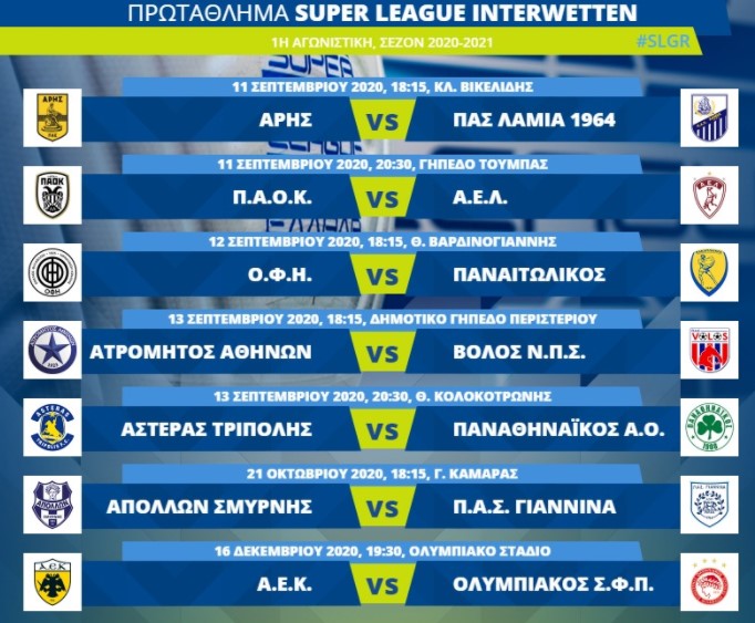 Το ντέρμπι πρωταθλήματος ΑΕΚ-Ολυμπιακός θα διεξαχθεί στις 16 Δεκεμβρίου, ενώ ο αγώνας Απόλλων Σμύρνης-ΠΑΣ Γιάννινα που επίσης θα αναβλήθηκε, θα γίνει στις 21 Οκτωβρίου.