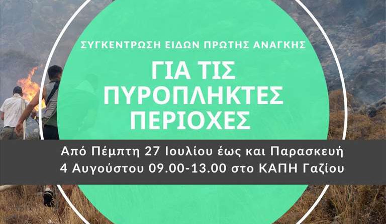 Η συγκέντρωση των ειδών πρώτης ανάγκης θα γίνεται από την Πέμπτη 27 Ιουλίου έως και την Παρασκευή 4 Αυγούστου στο ΚΑΠΗ Γαζίου(πλατεία Μιχ. Κατσαμάνη) από τις 09.00 – 13.00 μ.μ.