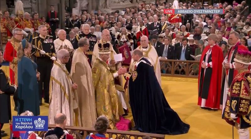Ο βασιλιάς Κάρολος φάνηκε συγκινημένος, όταν ο πρωτότοκος γιος του πρίγκιπας Ουίλιαμ απέτισε φόρο τιμής γονατιστός, στη διάρκεια της τελετής, και δήλωσε πίστη.