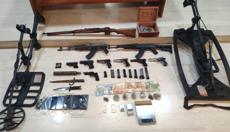 Βρέθηκαν και κατασχέθηκαν μεταξύ άλλων τρία πολεμικά τυφέκια, έξι πιστόλια και το χρηματικό ποσό των 1.635 ευρώ