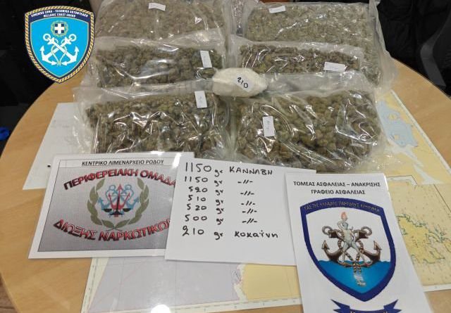 Συγκεκριμένα, σε έλεγχο που διενεργήθηκε στον ανωτέρω ημεδαπό στον λιμένα Ακαντιάς Ρόδου, μετά τον κατάπλου επιβατηγού – οχηματαγωγού (Ε/Γ-Ο/Γ) πλοίου, βρέθηκαν εντός των αποσκευών του έξι συσκευασίες περιέχουσες ποσότητα πιθανόν ακατέργαστης κάνναβης συνολικού μεικτού βάρους τεσσάρων κιλών και τριακοσίων πενήντα γραμμαρίων (4.350 gr) και μία αυτοσχέδια συσκευασία περιέχουσα ποσότητα πιθανόν κοκαΐνης συνολικού μεικτού βάρους διακοσίων δέκα γραμμαρίων (210 gr).