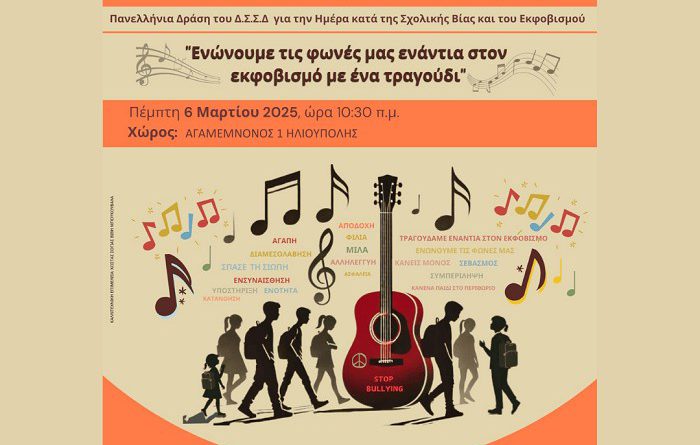 Η εκδήλωση, με τίτλο "Ενώνουμε τις φωνές μας ενάντια στον εκφοβισμό με ένα τραγούδι", περιλαμβάνει τη συμμετοχή σχολείων από όλη την Ελλάδα, τα οποία έχουν δημιουργήσει το καθένα το δικό του πρωτότυπο τραγούδι με στίχους που προάγουν τη συμπερίληψη και την αλληλεγγύη. Οι μαθητές, κρατώντας αφίσες, θα παρουσιάζουν το τραγούδι τους στη γειτονιά (μπροστά από το 1ο Γυμνάσιο και Λύκειο Ηλιούπολης, 5ο και 20ο Δημοτικά ) μεταδίδοντας μέσα από τη μουσική ένα ισχυρό μήνυμα κατά της σχολικής βίας και του εκφοβισμού.