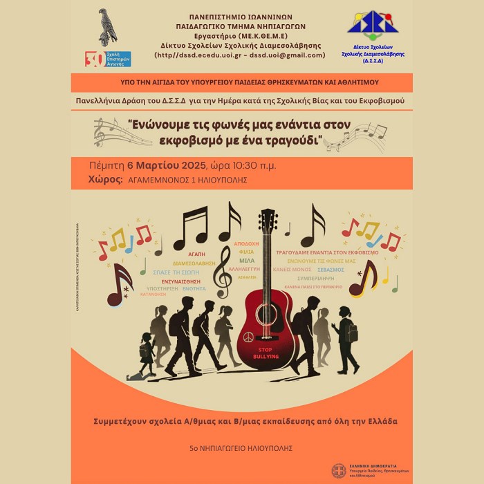 Το 5ο Νηπιαγωγείο Ηλιούπολης, σε συνεργασία με το Δίκτυο Σχολείων Σχολικής Διαμεσολάβησης της Σχολής Επιστημών Αγωγής του Πανεπιστημίου Ιωαννίνων, διοργανώνει μια πανελλήνια δράση αφιερωμένη στην Ημέρα κατά της Σχολικής Βίας και του Εκφοβισμού, σήμερα 6 Μαρτίου 2025, υπό την αιγίδα του Υπουργείου Παιδείας, Θρησκευμάτων και Αθλητισμού.