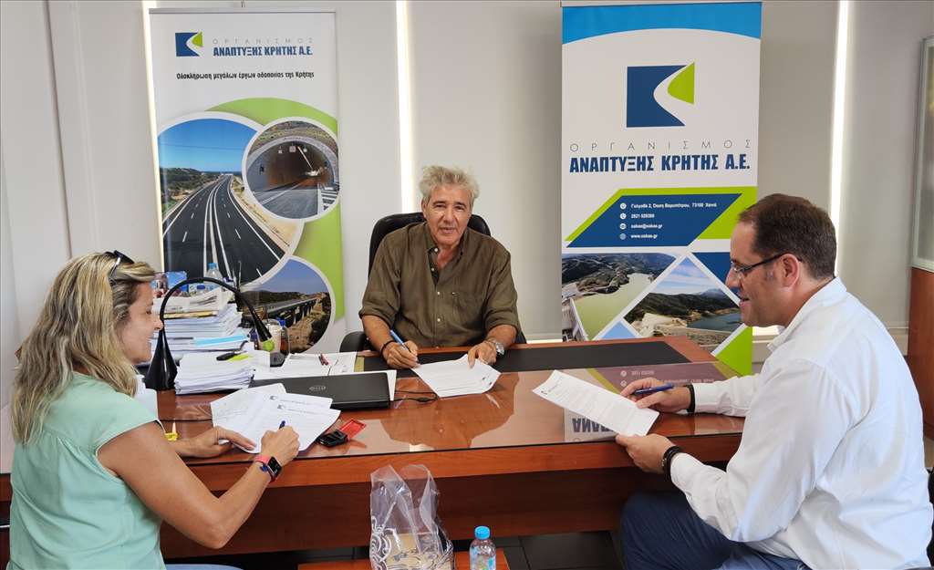 Την σύμβαση που αφορά την κατασκευή του έργου «Ανάπλαση Οικισμού Ανωγείων, Υποέργο 2: Ανάπλαση Συνεκτικού Τμήματος Οικισμού Ανωγείων», υπέγραψαν την Τρίτη 19/7/2022 στα γραφεία του Οργανισμού Ανάπτυξης Κρήτης στην Αγυιά Χανίων, ο Διευθύνων Σύμβουλος του Ο.Α.Κ., κ. Άρης Παπαδογιάννης, ο Δήμαρχος Ανωγείων, κ. Σωκράτης Κεφαλογιάννης και η νόμιμος εκπρόσωπος της «ΚΡΕΤΑ ΚΑΤ ΑΝΩΝΥΝΗΜ ΤΕΧΝΙΚΗ ΕΤΑΙΡΕΙΑ», κ. Ειρήνη Σκουραδάκη .
