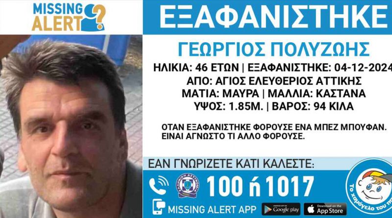Συναγερμός σήμανε στις Αρχές για την εξαφάνιση 46χρονου από τον Άγιο Ελευθέριο Αττικής. Πρόκειται για τον Γεώργιο Πολυζώη, τα ίχνη του οποίου χάθηκαν το πρωί στις 02/12/2024.