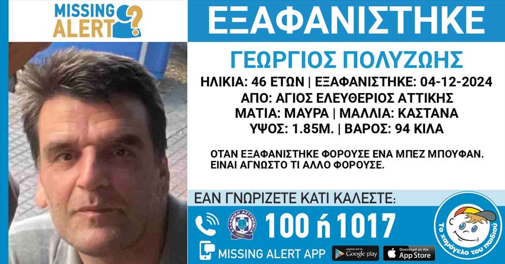 Συναγερμός σήμανε στις Αρχές για την εξαφάνιση 46χρονου από τον Άγιο Ελευθέριο Αττικής. Πρόκειται για τον Γεώργιο Πολυζώη, τα ίχνη του οποίου χάθηκαν το πρωί στις 02/12/2024.