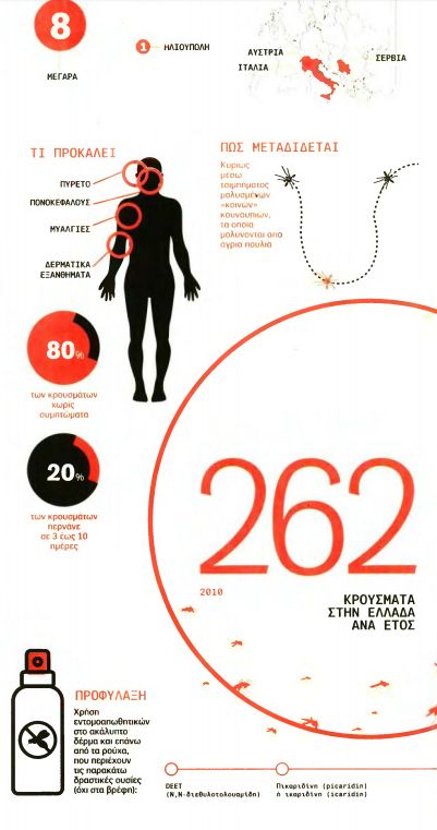 Τα περισσότερα από τα κρούσματα έχουν εντοπιστεί στους Δήμους Μεγαρέων 8, Τανάγρας 1, Ηλιούπολης Αττικής 1 και Χαλκηδόνος Θεσσαλονίκης και οι 11 από τους 12 ασθενείς εμφάνισαν εκδηλώσεις από το κεντρικό νευρικό σύστημα εγκεφαλίτιδα ή/και μηνιγγίτιδα ή/και οξεία χαλαρή παράλυση ενώ ένας εμφάνισε απλό εμπύρετο νόσημα.